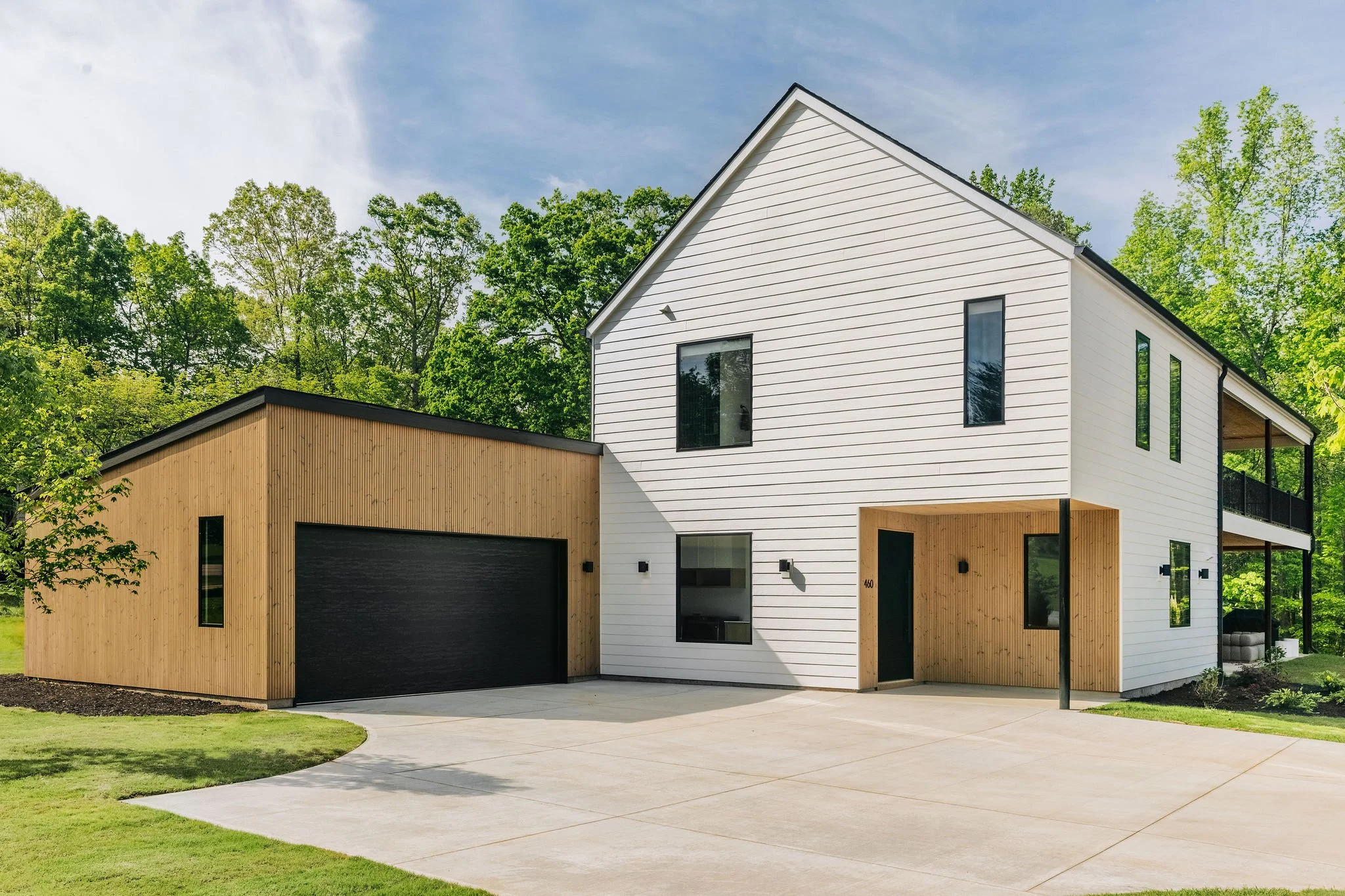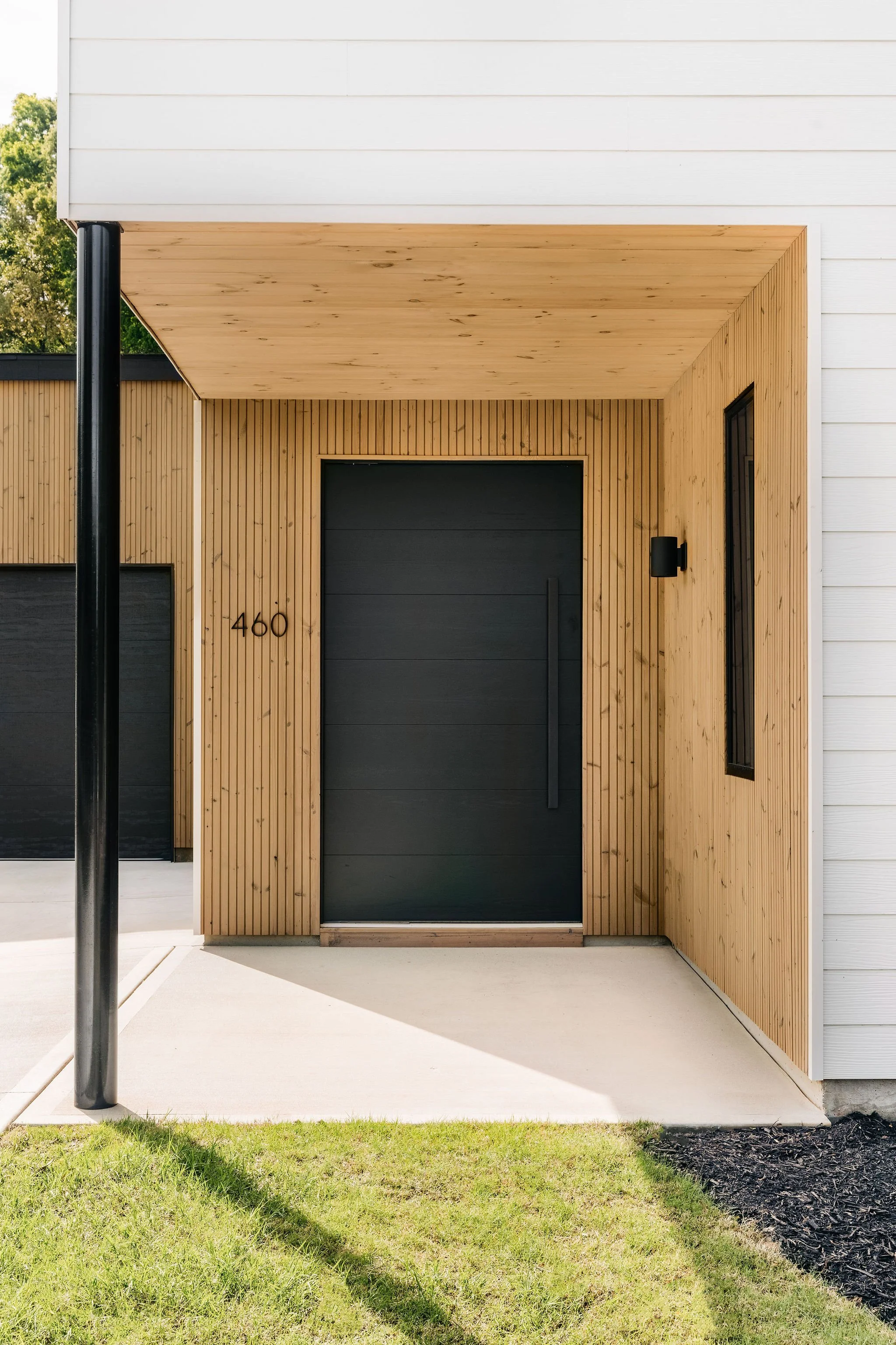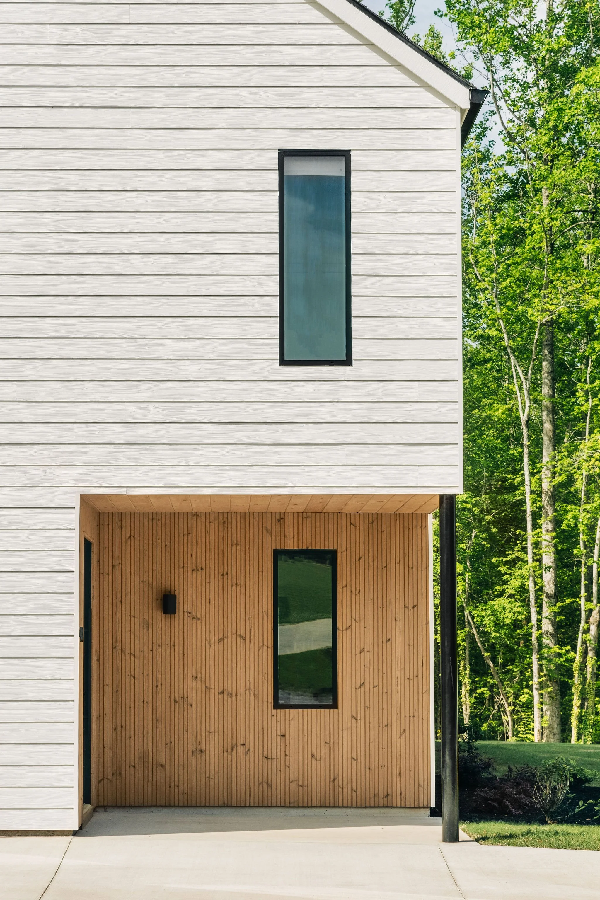 This home was originally designed as the first of four houses on the same street: all following the same design concept, but each home with unique features. The design concept consists of simple main volumes with a gable roofs, with cut out porches throughout the home cladded in Thermowood siding, and paired with a semidetached garage building.
