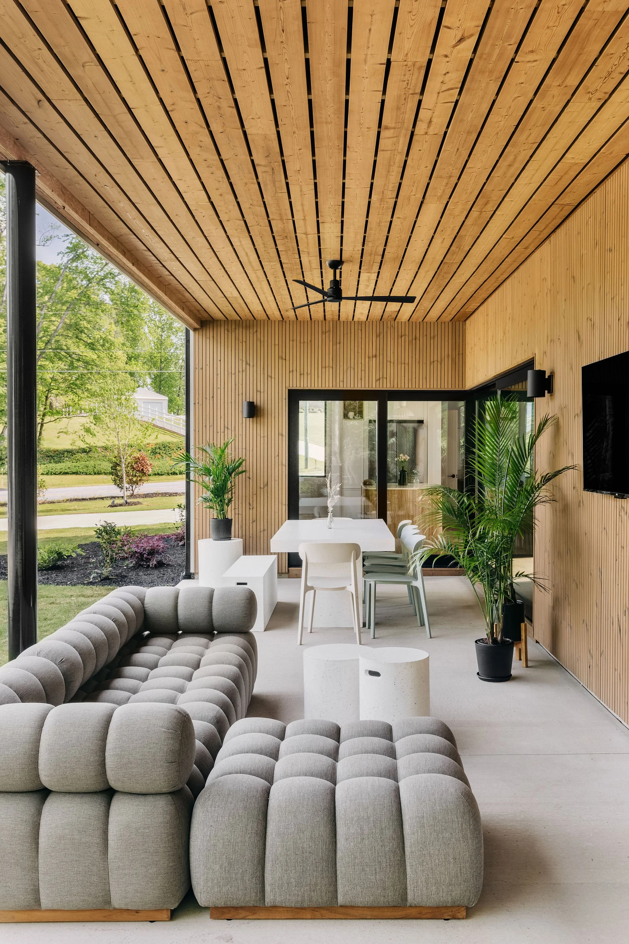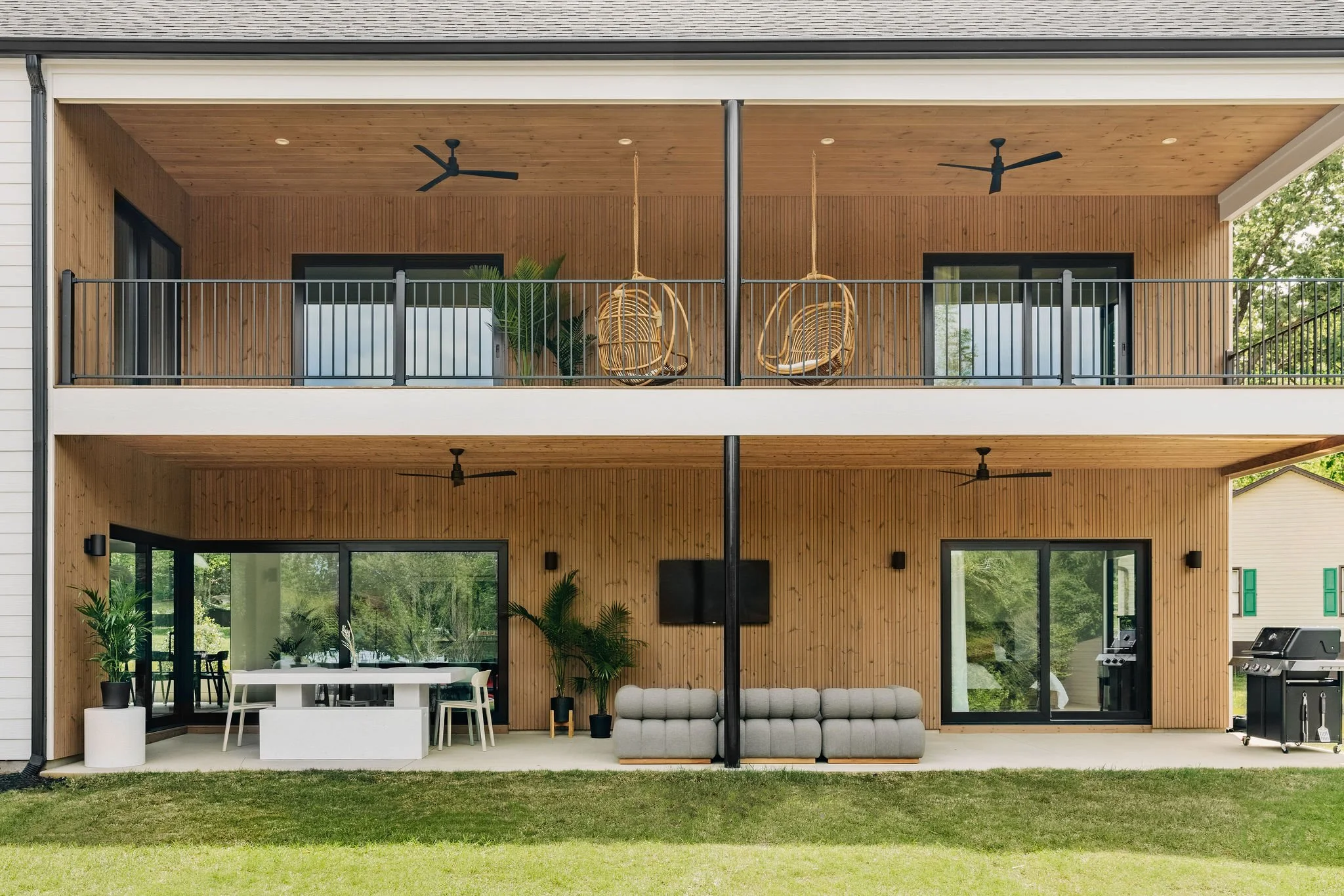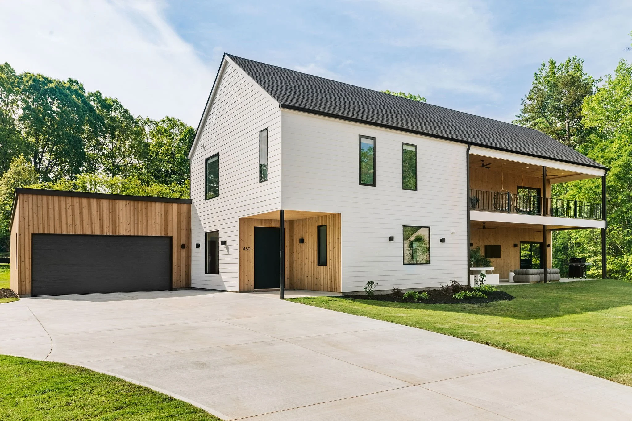 This home was originally designed as the first of four houses on the same street: all following the same design concept, but each home with unique features. The design concept consists of simple main volumes with a gable roofs, with cut out porches throughout the home cladded in Thermowood siding, and paired with a semidetached garage building.